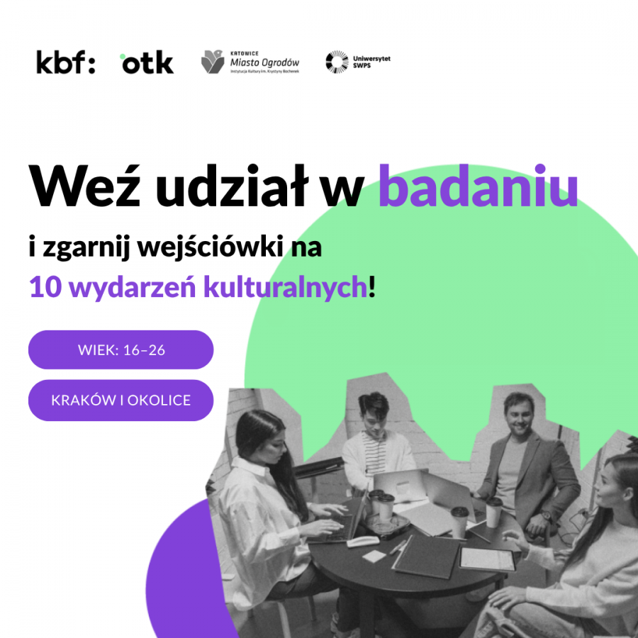 Przekazujemy informację o możliwości udziału w projekcie badawczym „Kultura na receptę”, realizowanym przez Obserwatorium Trendów dla Kultury (KBF), SWPS oraz Katowice Miasto Ogrodów. Projekt dotyczy wpływu uczestnictwa w kulturze na dobrostan psychiczny i regulację emocji młodych dorosłych.