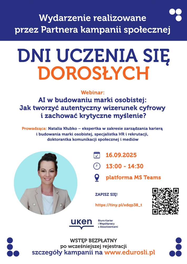 AktualnościSerdecznie zapraszamy na webinar pt.: „AI w budowaniu marki osobistej: Jak tworzyć autentyczny wizerunek cyfrowy i zachować krytyczne myślenie?” organizowany przez nasze Biuro Karier w ramach tegorocznej kampanii „Dni uczenia się dorosłych”!