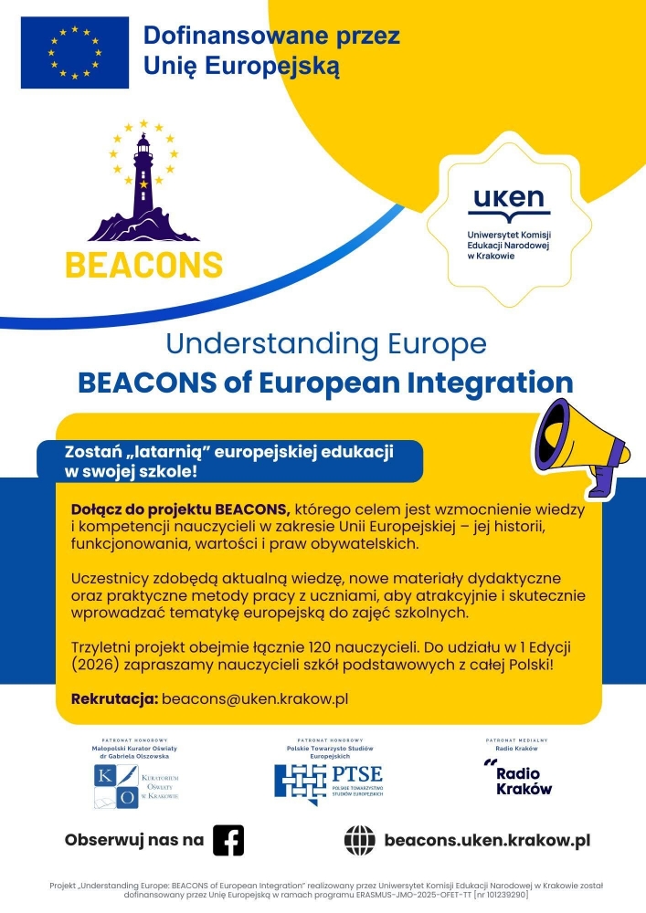 Uniwersytet Komisji Edukacji Narodowej w Krakowie zaprasza do udziału w ogólnopolskim, bezpłatnym projekcie „Understanding Europe: BEACONS of European Integration”, realizowanym w ramach programu Erasmus+ (Jean Monnet).